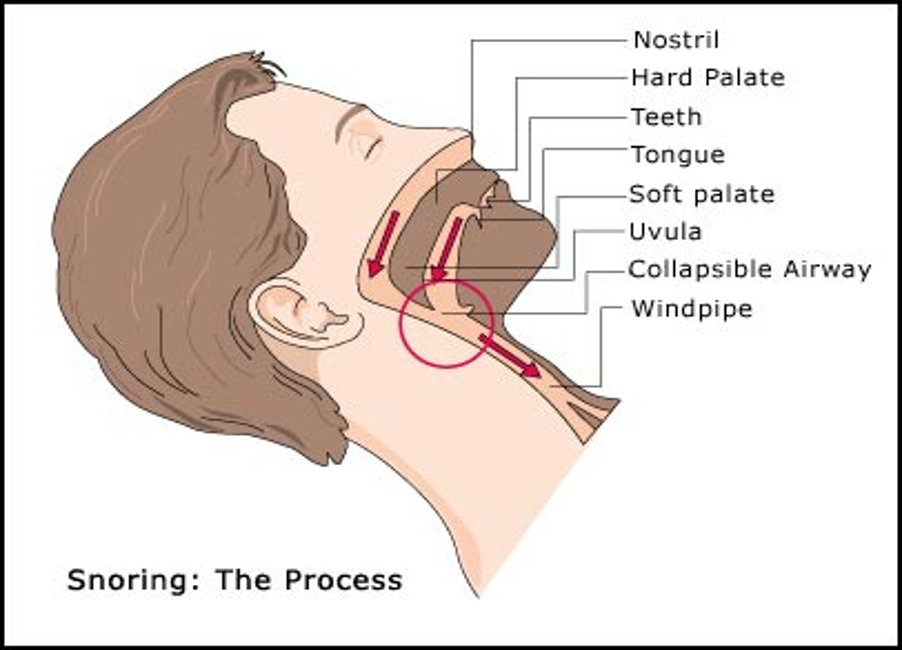 Snoring occurs when air cannot flow smoothly through upper air passages. It can also occur when there are anatomical structures in the air passages which vibrate whilst breathing. There may be several causes: